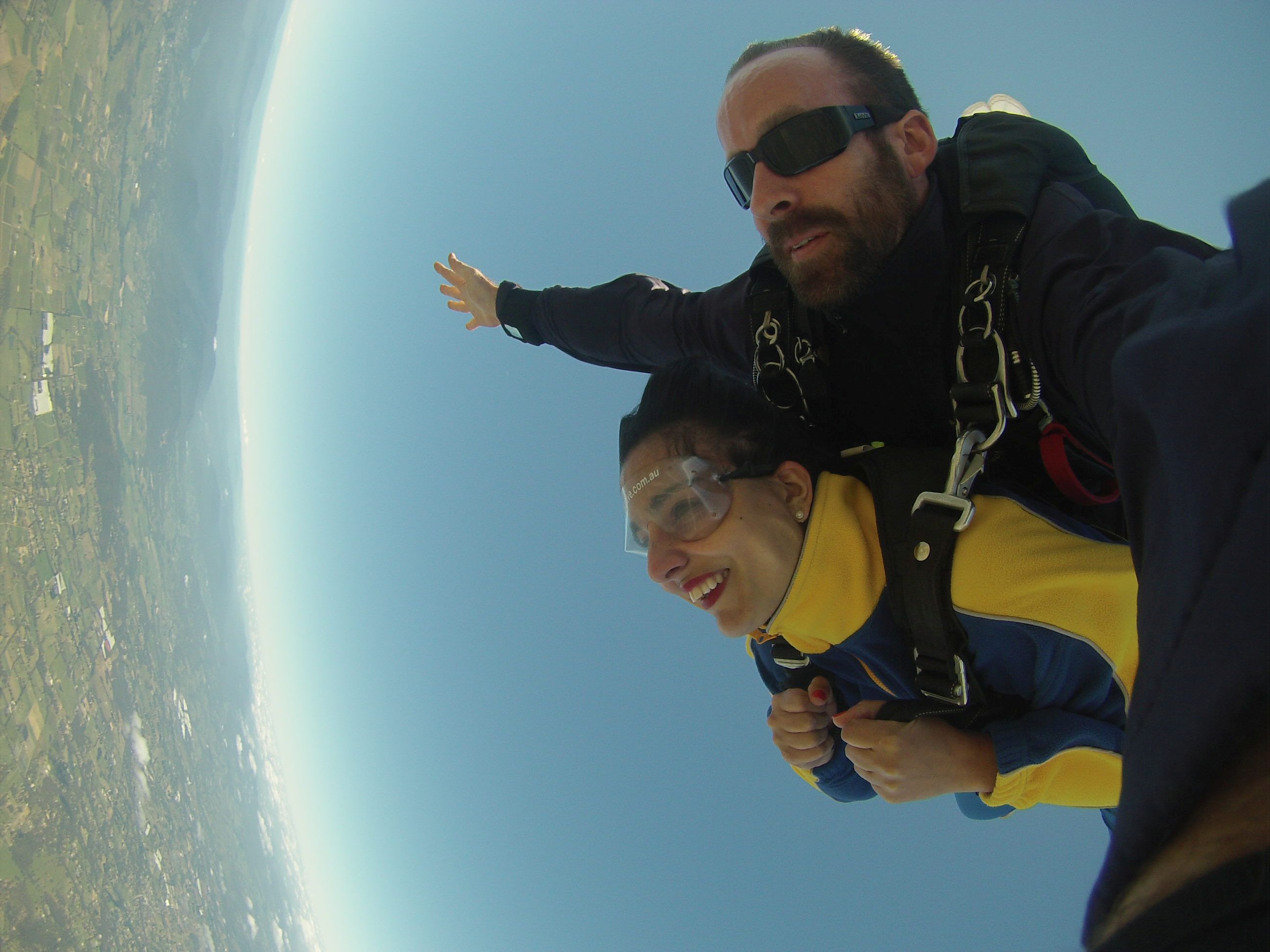 Instead, I found myself at 12,000 feet above the ground in a tiny Cessna, strapped to and sitting on the lap of a young man I’d met only half an hour earlier. We traded in clichés: ‘How long have you been doing this for?’ I asked him. ‘Today is my first day,’ he joked (I think…I hope…). ‘Shouldn’t you have bought me dinner first?’ I said as he strapped himself very tightly to me, pressing his body hard up against mine. Oh, how we laughed! Considering he was about to push himself out of a plane with me strapped to his front, we were very relaxed and chilled!
