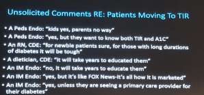 But perhaps the most unsettling was what they thought about non-endocrinologists willingness to start to talk TIR. (I think that they were mostly referring to primary care physicians.)