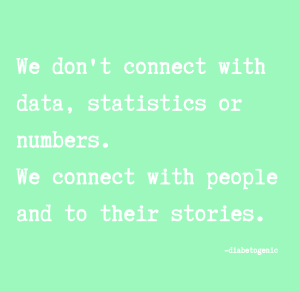 Too often, the story of diabetes is told using statistics. That is the way researchers and healthcare professionals and governments talk. But for those of us actually living with diabetes, it will never be about the one in how-ever-many-thousand. We don’t want to hear how the dice is likely to roll or how the numbers keep getting more and more stacked against us the longer we live with this condition. We don’t connect with data, statistics or numbers. We connect with people and to their stories. That’s what we need to tell. And that’s what we need to hear.