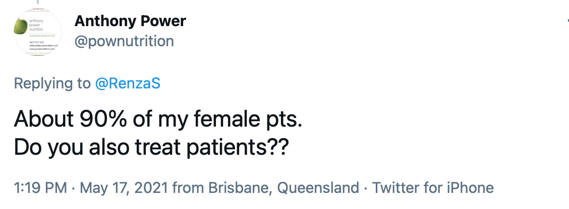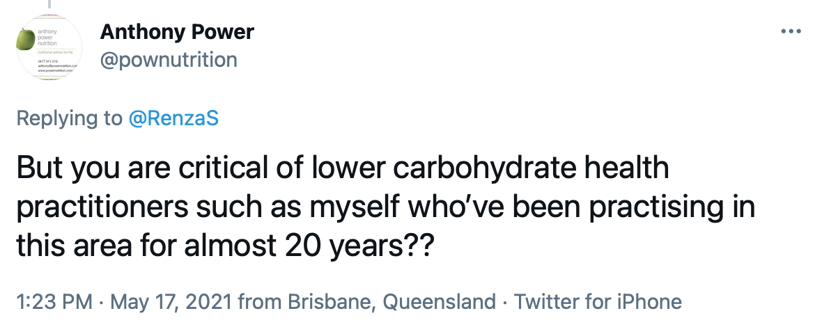 And then, out of the blue, came a reply from a nutritionist. A nutritionist I have never encountered before. I don’t follow him on Twitter, I have no idea who he is. Which is all fine. My Twitter is public and if I ask a question everyone is free to offer their input. Here is his reply: