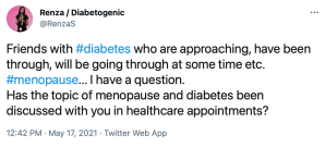 I guess I shouldn’t have been surprised really at what happened earlier this week just before I published a post on diabetes and menopause. As I often do, I look to the community for others’ experiences. And so, I tweeted (and shared on Facebook) this: