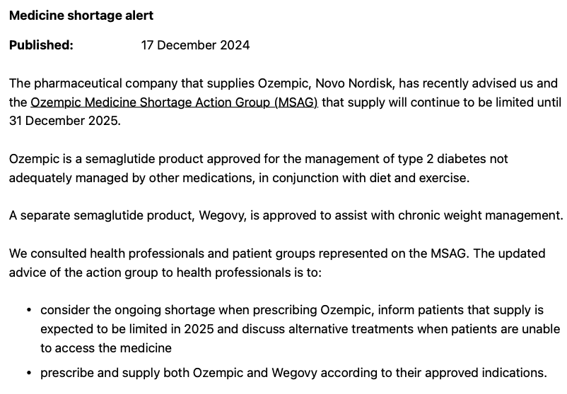 The TGA has, once again, advised that Ozempic shortages in Australia are ongoing and in their brief statement they say this: