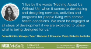 The other speakers in the symposium all shared their own examples of where the principles of co-design had been applied with great success. Melinda Seed spoke about the Type 1 Network and how that grew from a gap of providing support and information for young adults with diabetes; Frank Sita shared his experiences of being on the Perth Diabetes Care Young Adults with Diabetes Committee and Melinda Morrison provided an overview of stakeholder involvement and engagement in the NDSS Diabetes and Pregnancy priority area.