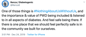 ‘I highlighted for me what is the most important thing when we are talking about the DOC: No one owns this community. No one is more important or more relevant or more powerful. Sure, some of us are very fortunate that we get to actually meet IRL and attend conferences, but we do it as part of our jobs – whether it be like me (through my work at a diabetes organisation mixed with my online work) or through independent consulting or other work. But regardless if you are in the room or following along on Twitter, everyone has the same right to be here and to be part of it.’
