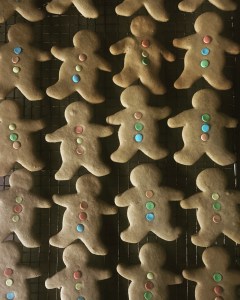 The kidlet decided that we’d not made gingerbread folks for a while. So we did. And they were so much fun, dressed in bright colourful candied-sugar buttons!