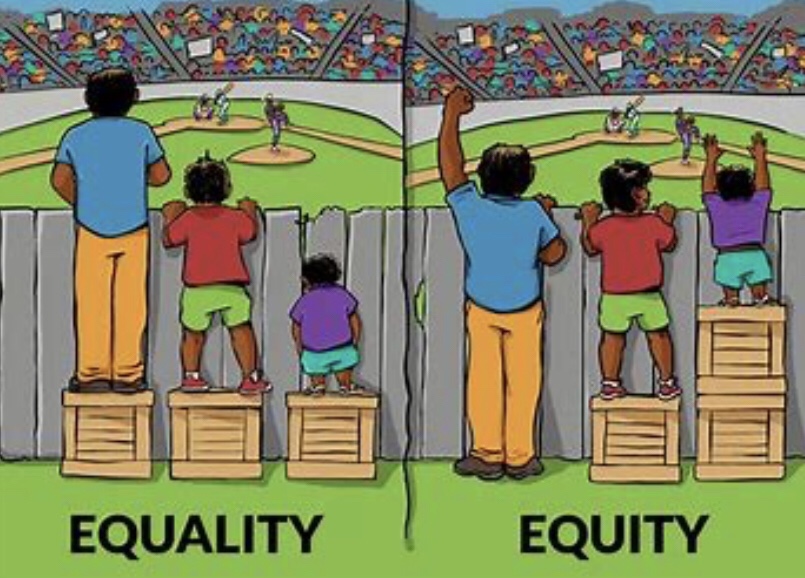 While point 3 is true, point 1 and 2 may not be the case. In point 1, many people in my study expressed that they treat all people the same which is probably true, but does that mean the people they care for receive equitable care or equal chance of access? Review this famous picture which makes it abundantly clear that we must do different things to achieve the same outcome.