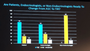 And then the talk got fun as the focus shifted to just how ready different groups were to shift from a focus on A1c to TIR. The three groups were: people with diabetes (and their families), endocrinologists and non-endocrinologists. Irl presented the results from a survey of diabetes HCPs asking their thoughts on the readiness of those three groups to embrace TIR. Here are the results: