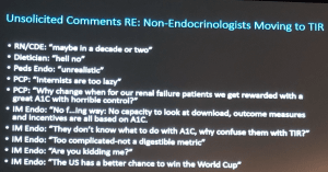 But perhaps the most unsettling was what they thought about non-endocrinologists willingness to start to talk TIR. (I think that they were mostly referring to primary care physicians.)