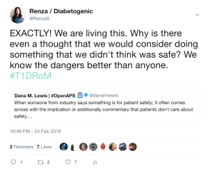 I say this without an ounce of disrespect, but when a device company or HCP implies – intentionally or otherwise – that those of us using a DIY system are being reckless and being unsafe, I find it insulting, and a little disingenuous, because any conceivable hazard is highest to those of us who have the devices stuck to our bodies, and using an algorithm that decides how much insulin to push into our bodies.