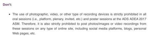 However, I have never known it to be enforced the way it was last week with a multifaceted approach of vigilant soldiers in red approaching anyone daring to photograph a slide during talks or in the Poster Hall, as well as social media (mostly Twitter) responses being fired left right and centre to anyone who then tweeted a photo.